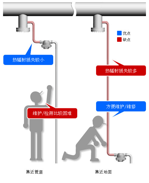 缺点:作为蒸汽主管的延伸,向下的垂直管道越长意味着热辐射损失越多。(在不影响疏水阀运行的前提下,可以通过安装保温来减少热辐射损失)
