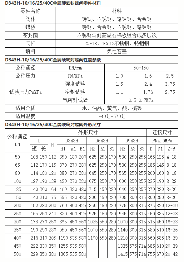 D343H-10/16/25/40C金属硬密封蝶阀公称压力范围为PN10~PN40。 D43H手动多层次金属硬密封蝶阀采 用精密的J形弹性密封圈和三偏心多层次金属硬密封结构,被广泛用于介质温度≤425℃的治金、电力、石油 化工、以及给排水和市政建设等工业管道上,作调节流量和载断流体使用。