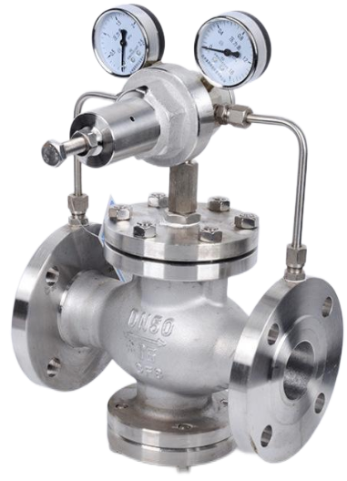 YK43X/F/Y气体减压阀主要用于气体管路,如空气、氮气、氧气、氢气、煤气、液化气、天然气等气体。本系列减压阀属于先导活塞式减压阀。由主阀和导阀两部分组成。主阀主要由阀座、主阀盘、活塞、弹簧等零件组成。导阀主要由阀座、阀瓣、膜片、弹簧、调节弹簧等零件组成。通过调节调节弹簧压力设定出口压力、利用膜片传感出口压力变化,通过导阀启闭驱动活塞调节主阀节流部位过流面积的大小,实现减压稳压功能。