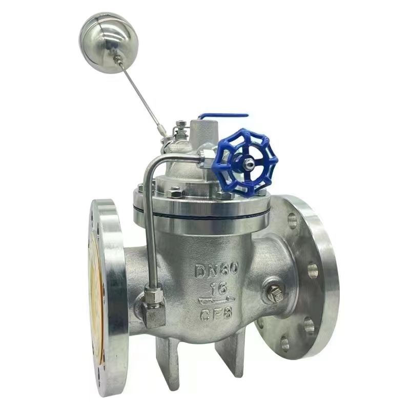 不锈钢遥控浮球阀是利用浮球的开关动作控制主阀,以保证水池、水库液位的高度控制于一恒定的高度,浮球阀是一个开关阀,当液位到达设定值时主阀紧密关闭, 本产品广泛应用于高层建筑、生活区管网系统的水塔、水池等液面控制。